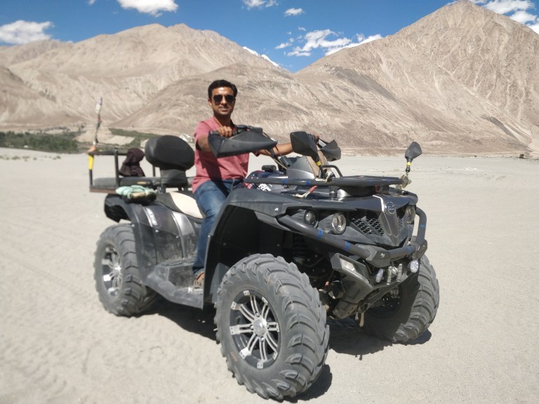 There are many activities (read mild adventure) on the way from Leh to Hundar. One being ATV bike ride. Personally this is my favorite one. ATV means All Terrain Vehicle and not so surprisingly ATV quad (4-wheeler) bikes are used on the sand dunes. They charge you INR 1000 for one ride which covers about 4-5 kms of 15-20 mins. The best part is the guide lets you drive if you are confident. He will sit with you to guide you wherever required.