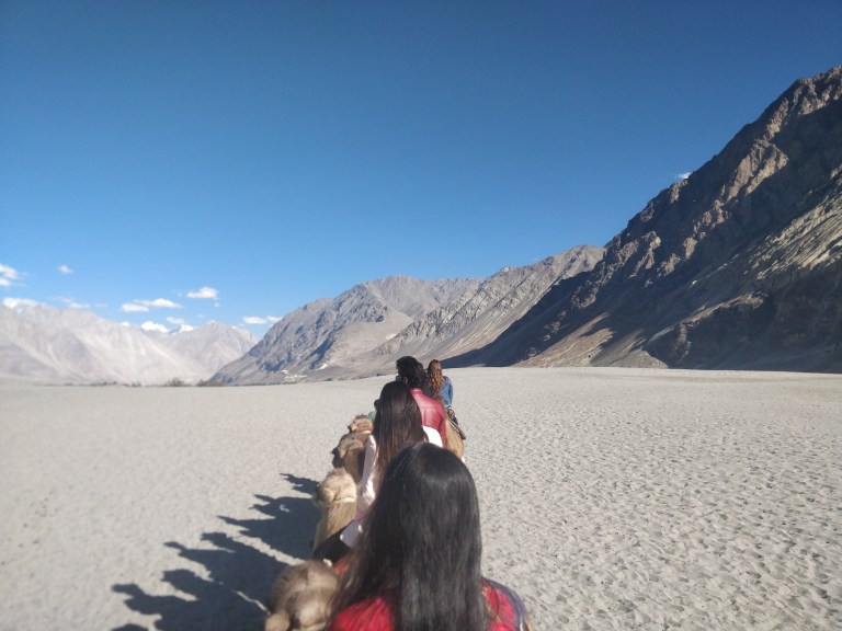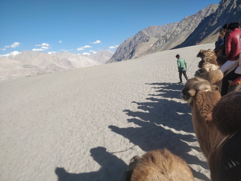 When we think of deserts we immediately remember camels and vice-versa. Camels and Deserts go hand in hand. Likewise we have cold desert with sand dunes here so we see a different type of camels in this area. They are double humped and also called Bactrian Camels. These camels are available only in Nubra Valley in India. Camel Rides are one activity which one must try definitely because these camels are rarely available. You will be seated just between the 2 humps on the back of the camel. The rope tied to its face is connected to the back of another camel and goes on. The rope of the first camel is dragged by the caretaker on foot.