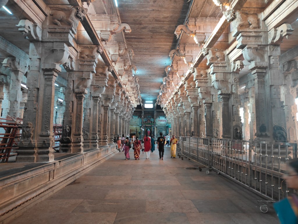 The temple architecture is stunning with long, intricately carved corridors typical of Chola architecture.